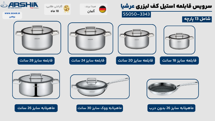 | سرویس کامل | SS050-3343 | 18-28 | متنوع | - | 17 | شیشهای | 13 قطعه: 4 قابلمه + 3 ماهیتابه |
