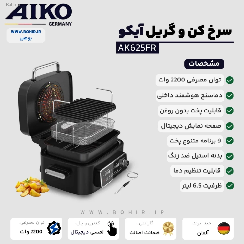 این دستگاه با داشتن قابلیت گرم نگهدارنده، غذا را در دمای مناسب و گرم نگه میدارد. همچنین با 9 عملکرد آماده پخت، سرخ کن و گریل AK625FR به شما این امکان را میدهد که انواع غذاها را با کارایی بالا و به راحتی آماده کنید. از پخت سریع مرغ و سیبزمینی تا گریل کردن انواع گوشت و سبزیجات، این دستگاه انتخابی ایدهآل برای هر آشپزخانه است.