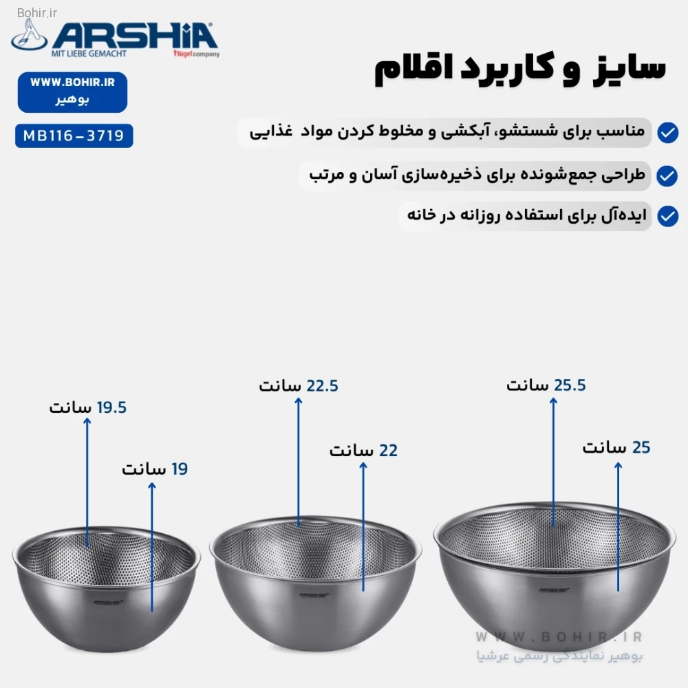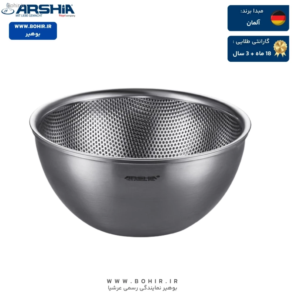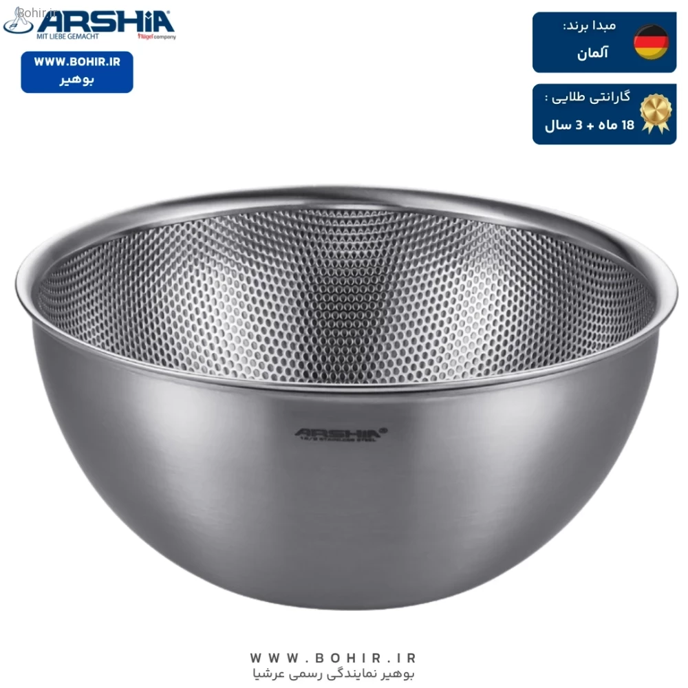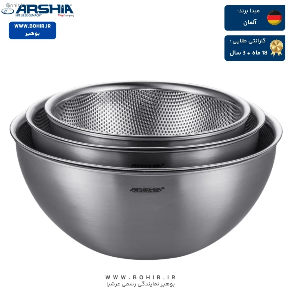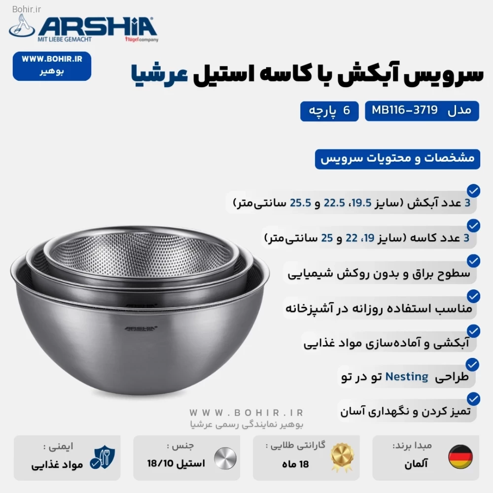 سرویس آبکش و کاسه مخلوط کن استیل 6 تکه عرشیا مدل MB116-3719 با طراحی مدرن و کاربرپسند، از استیل ضدزنگ ساخته شده که دوام و ماندگاری بالایی دارد. این ست برای شستشو، آبکشی و مخلوط کردن مواد غذایی بهطور همزمان بسیار مناسب است و به دلیل طراحی جمعشونده، فضای کمی را اشغال میکند. این ویژگی باعث میشود که در خانههای کوچک یا آشپزخانههای شلوغ، به راحتی بتوانید آن را نگهداری کنید.