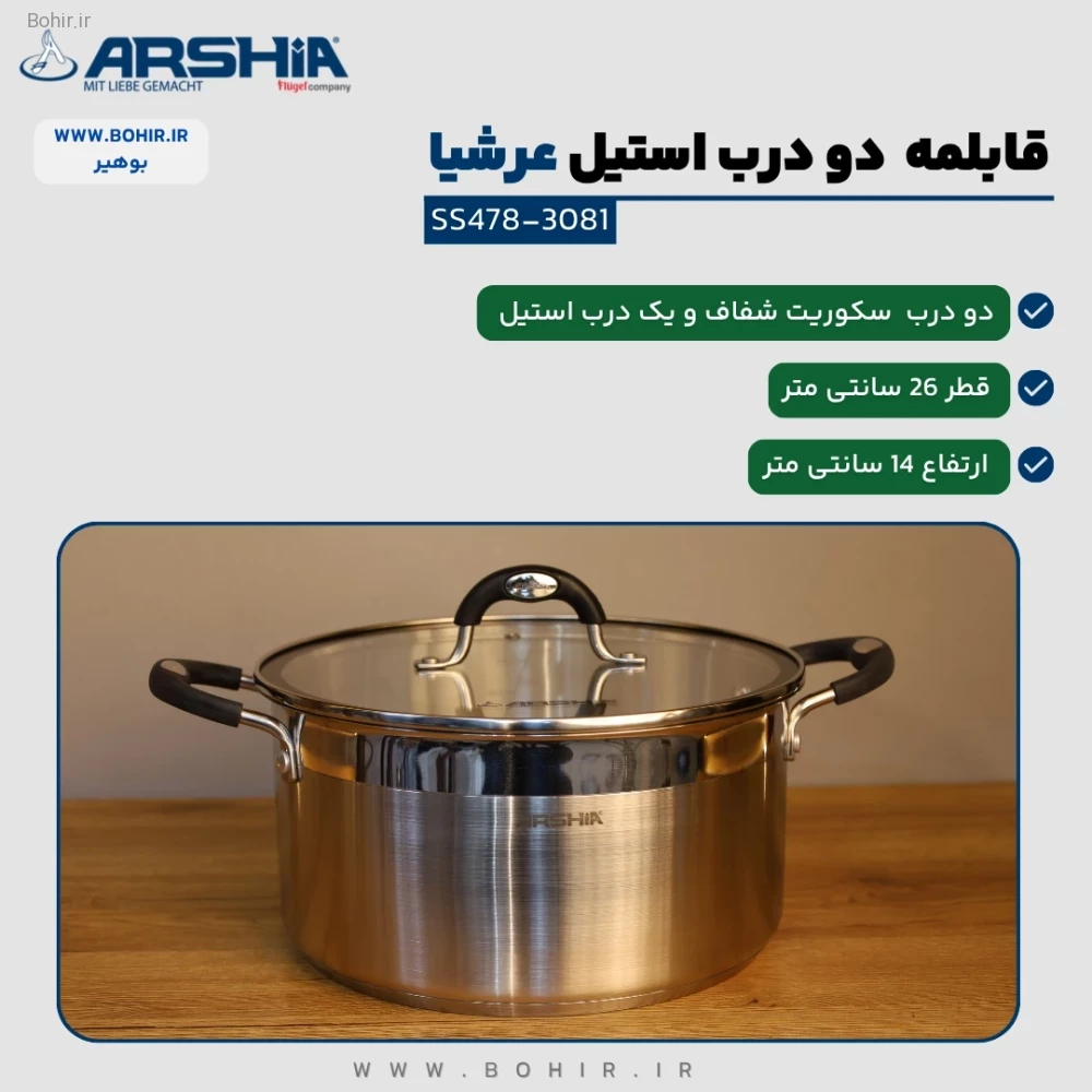 مشخصات قابلمه دو درب 26 سانت استیل عرشیا مدل SS478-3081