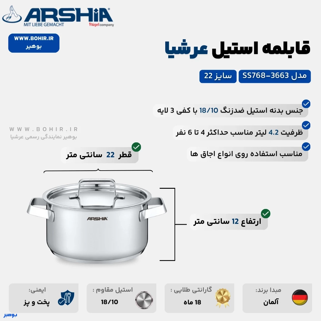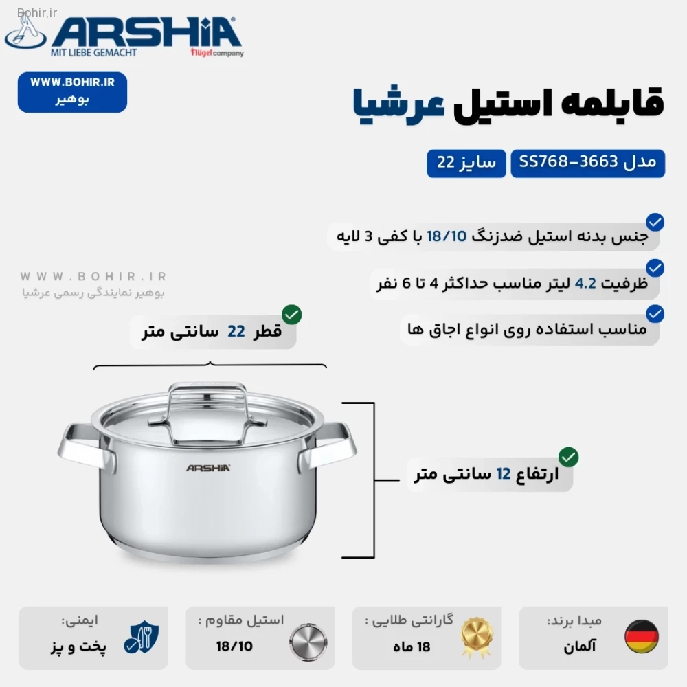 طراحی و ویژگی های قابلمه استیل 22 سانت عرشیا مدل 3663