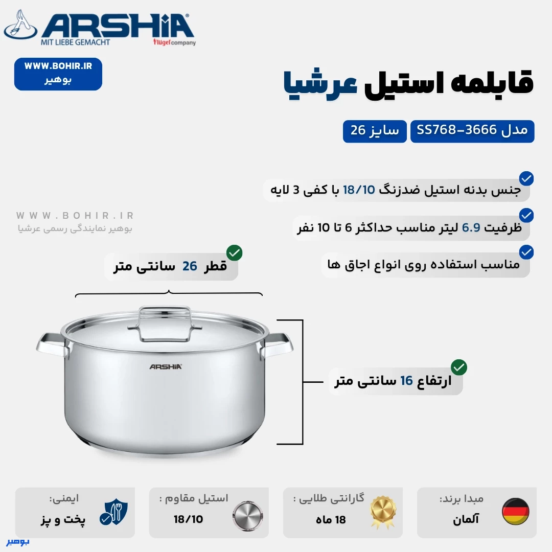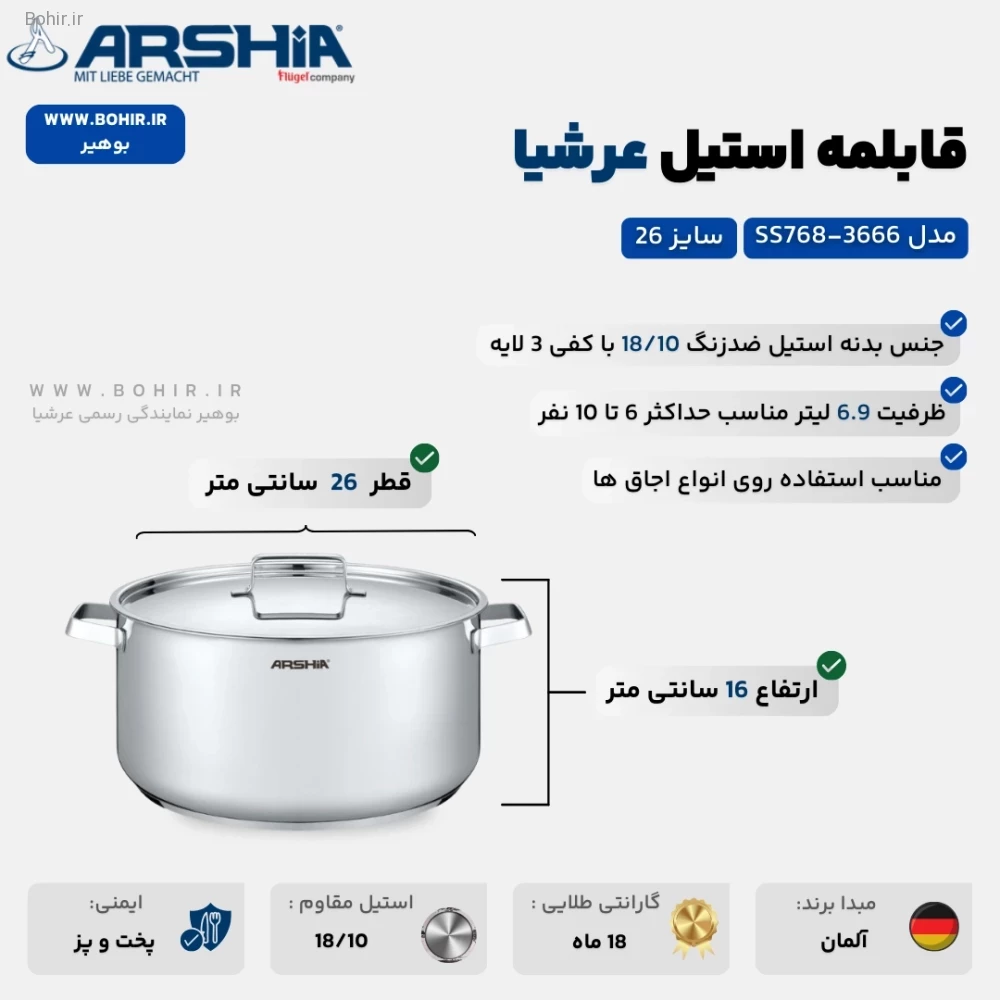 طراحی و ویژگی های قابلمه استیل سایز 26 عرشیا 3666