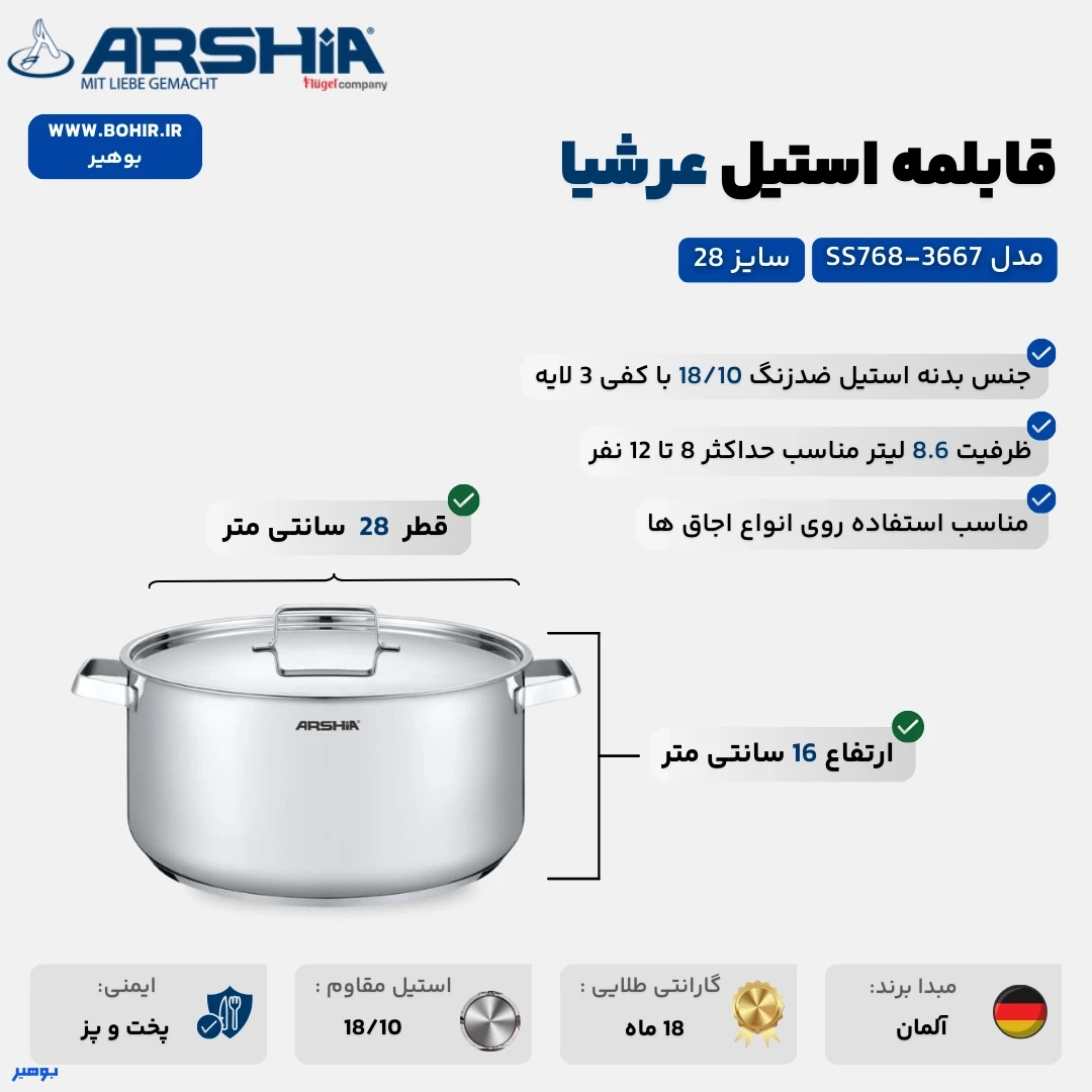 طراحی و ویژگی های قابلمه استیل 28 سانت عرشیا مدل SS768-3667