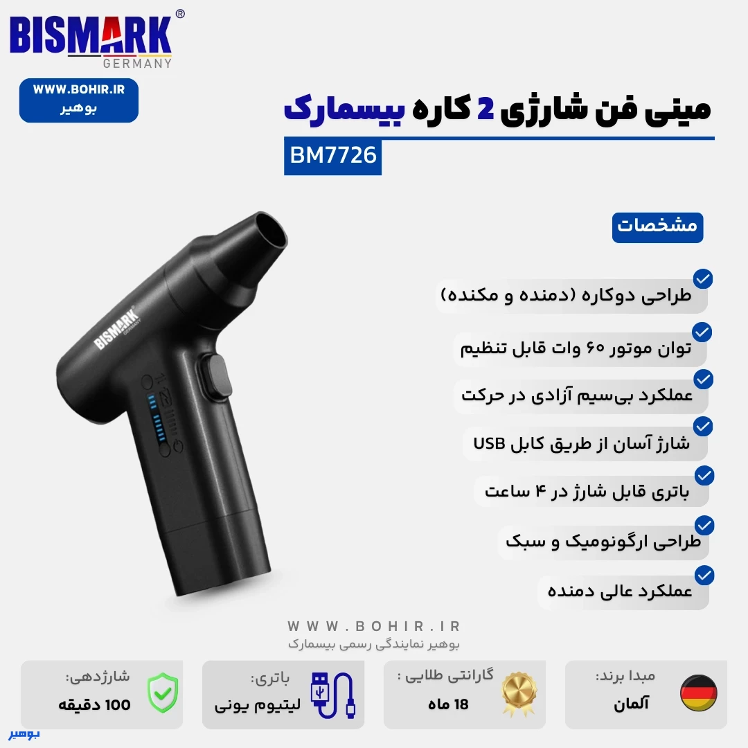 عملکرد و ویژگی های مینی فن شارژی بیسمارک مدل 7726
