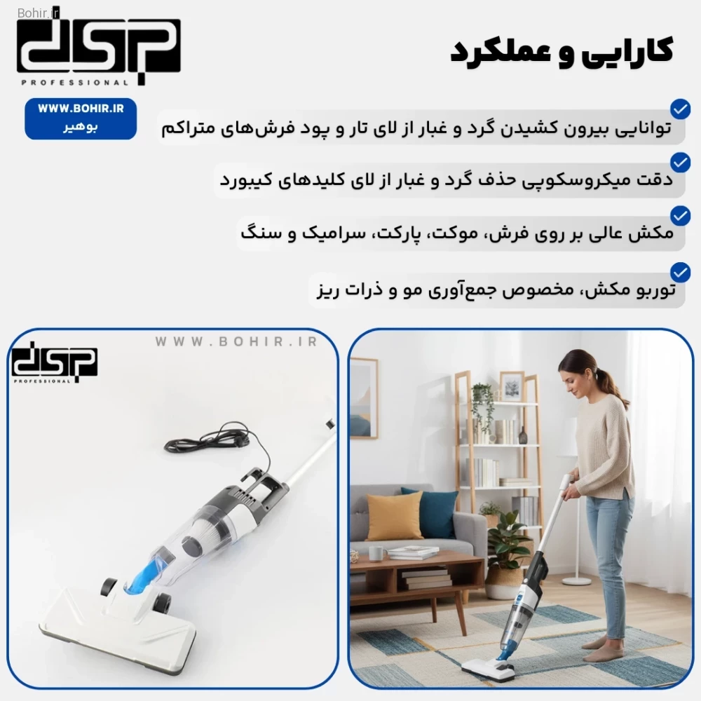 عملکرد موتور و قدرت مکش در نظافت جارو عصایی dsp مدل KD2031