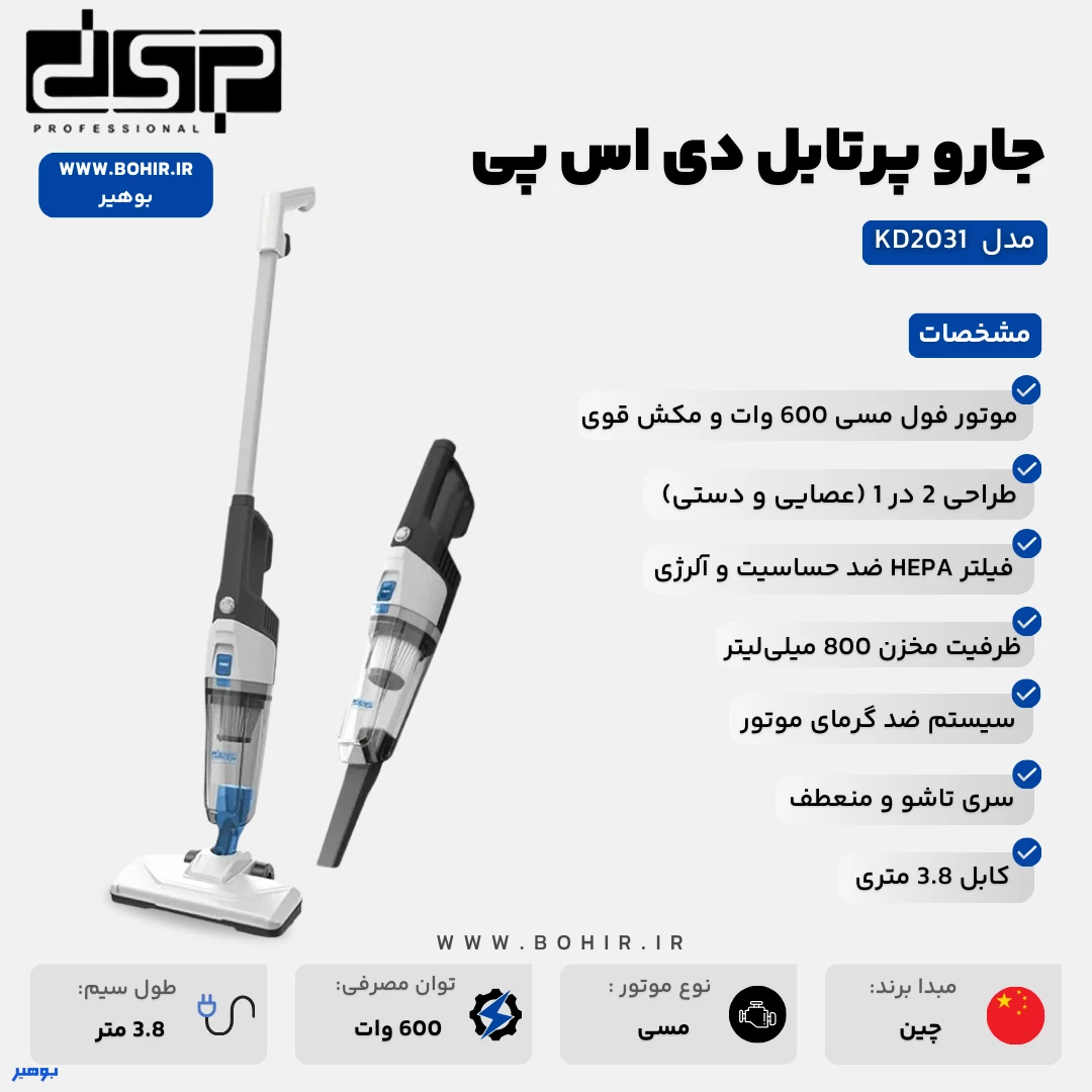 وقتی صحبت از جارو برقی عصایی به میان میآید، اولین دغدغه مشتری قدرت مکش است. جارو عصایی دی اس پی مدل KD2031 با بهرهگیری از یک موتور ۶۰۰ واتی تقویت شده، استانداردهای جدیدی را در این رده قیمتی تعریف کرده است. این دستگاه توانایی تولید ۱۶ کیلوپاسکال مکش واقعی را دارد که برای جمعآوری ذرات درشت، موی حیوانات و حتی گرد و غبار میکروسکوپی از لای تار و پود فرش فوقالعاده است. نکته متمایز کننده در جارو عصایی دی اس پی مدل KD2031، استفاده از سیستم برق مستقیم است؛ برخلاف مدلهای شارژی که با کاهش باتری دچار افت مکش میشوند، این جارو برقی ایستاده و دستی تا آخرین لحظه نظافت، قدرت یکنواخت خود را حفظ میکند. همچنین مجهز بودن به محافظ ضد گرمای موتور، طول عمر بالای دستگاه را در استفادههای مداوم تضمین میکند.