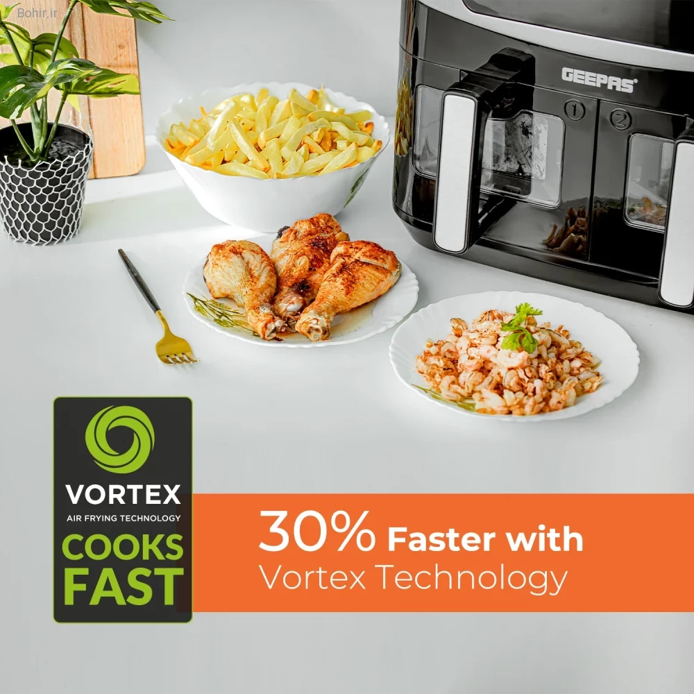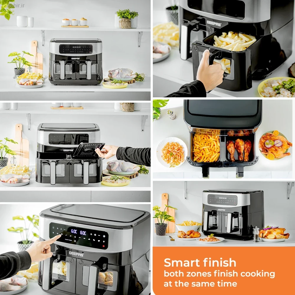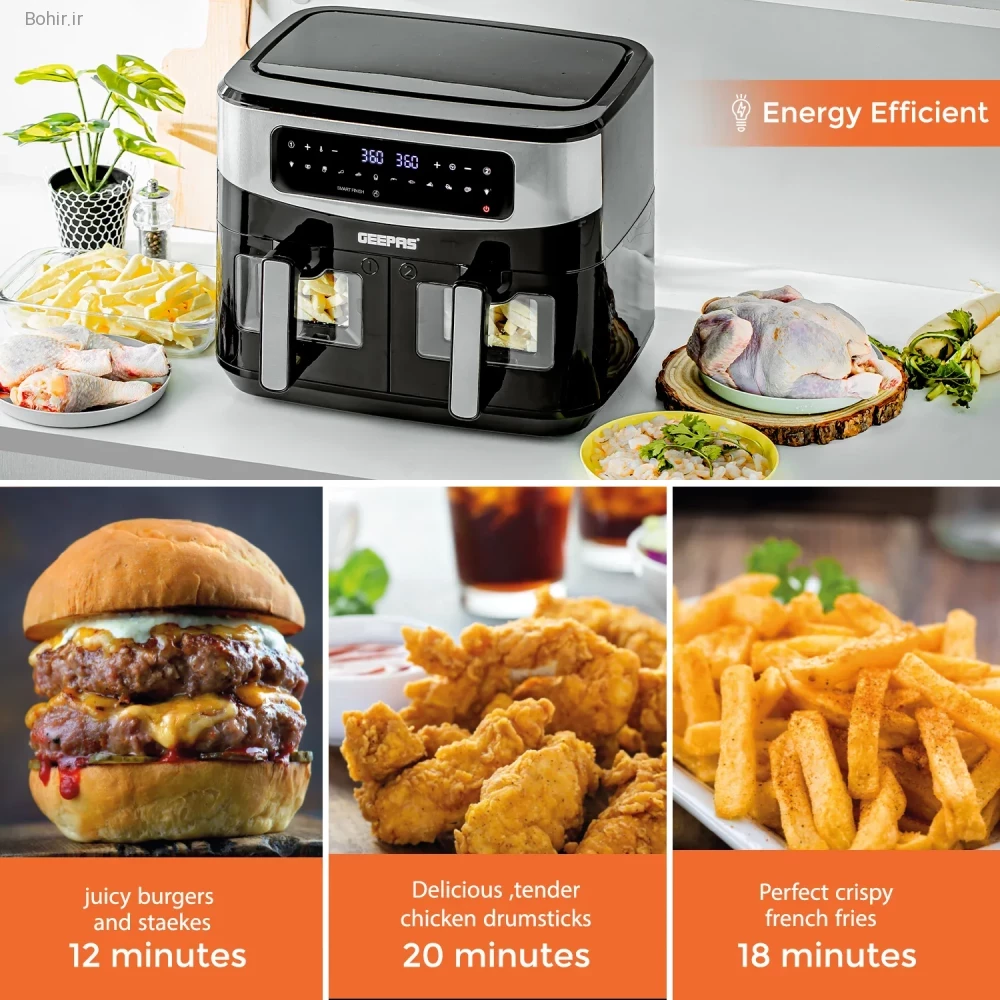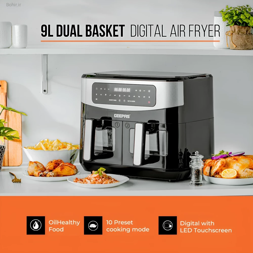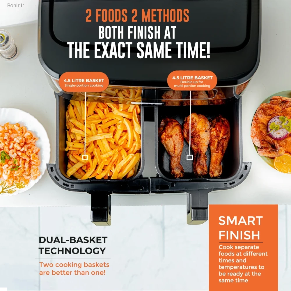 این مدل با ظرفیت ۹ لیتری و دو سبد ۴.۵ لیتری مجزا، امکان پخت همزمان دو نوع غذای مختلف را فراهم میکند. این ویژگی برای خانوادههای بزرگ و افرادی که میخواهند وعدههای غذایی متنوعی تهیه کنند، بسیار کاربردی است. طراحی دو قلوی مستقل کمک میکند تا بدون ترکیب شدن طعمها، دو غذای متفاوت با دمای مجزا پخته شوند.