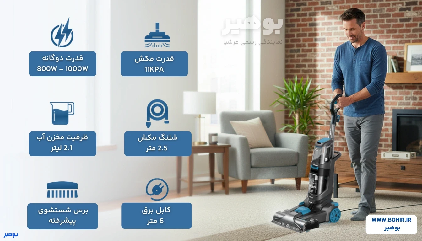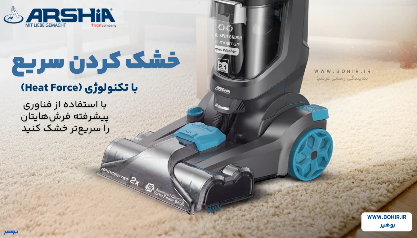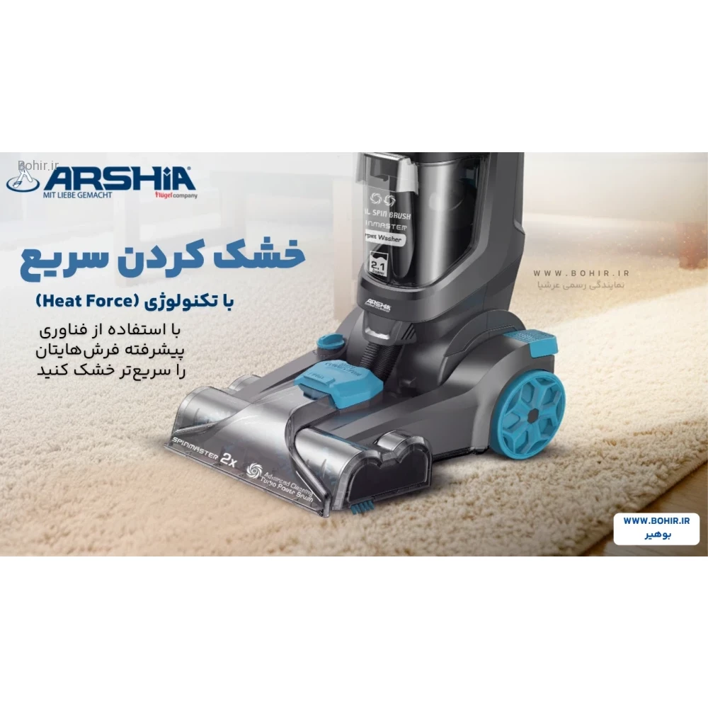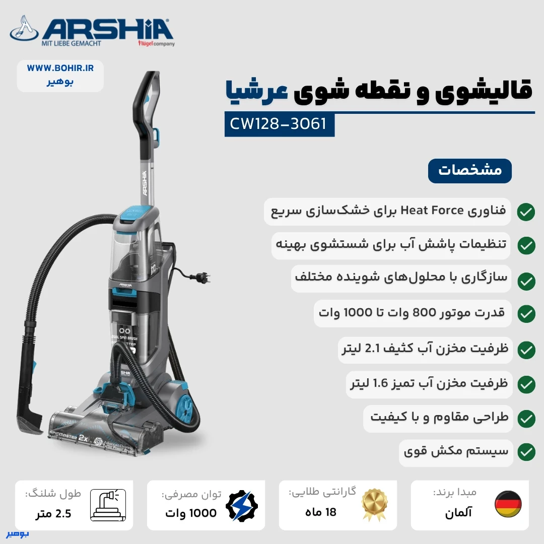 قالیشوی عرشیا مدل CW128-3061 با طراحی مدرن و شیک خود نه تنها عملکردی عالی دارد، بلکه به زیبایی محیط نیز افزوده میشود. طراحی ارگونومیک آن کاربری آسان و راحت را تضمین میکند. این دستگاه با داشتن ظاهر شیک و امکانات کاربردی، علاوه بر تمیزی عالی، تجربهای لذتبخش از استفاده فراهم میآورد.