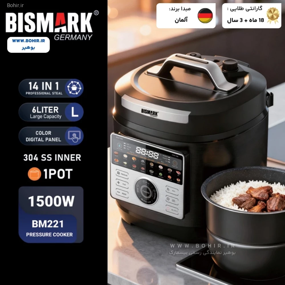 مولتی کوکر 6 لیتر بیسمارک مدل BM221 یک انتخاب حرفه‌ای برای آشپزی سریع، آسان و متنوع در آشپزخانه مدرن است. این دستگاه با توان قدرتمند 1500 وات، ظرفیت مناسب 6 لیتر و 14 برنامه پخت، امکان تهیه انواع غذا مانند برنج، خورشت، گوشت و بخارپز را فراهم می‌کند. دیگ استیل ضدزنگ 304، پنل دیجیتال پیشرفته و کیفیت ساخت بالا، این محصول بیسمارک را به گزینه‌ای ایده‌آل تبدیل کرده است. اگر به دنبال خرید مولتی کوکر بیسمارک با بهترین قیمت و عملکرد عالی هستید، این مدل انتخابی مطمئن است. بوهیر نمایندگی رسمی بیسمارک، این محصول را با گارانتی 18 ماه و ۵ سال خدمات پس از فروش بیسمارک سرویس ارائه می‌دهد.