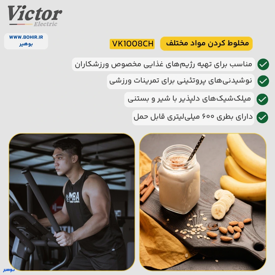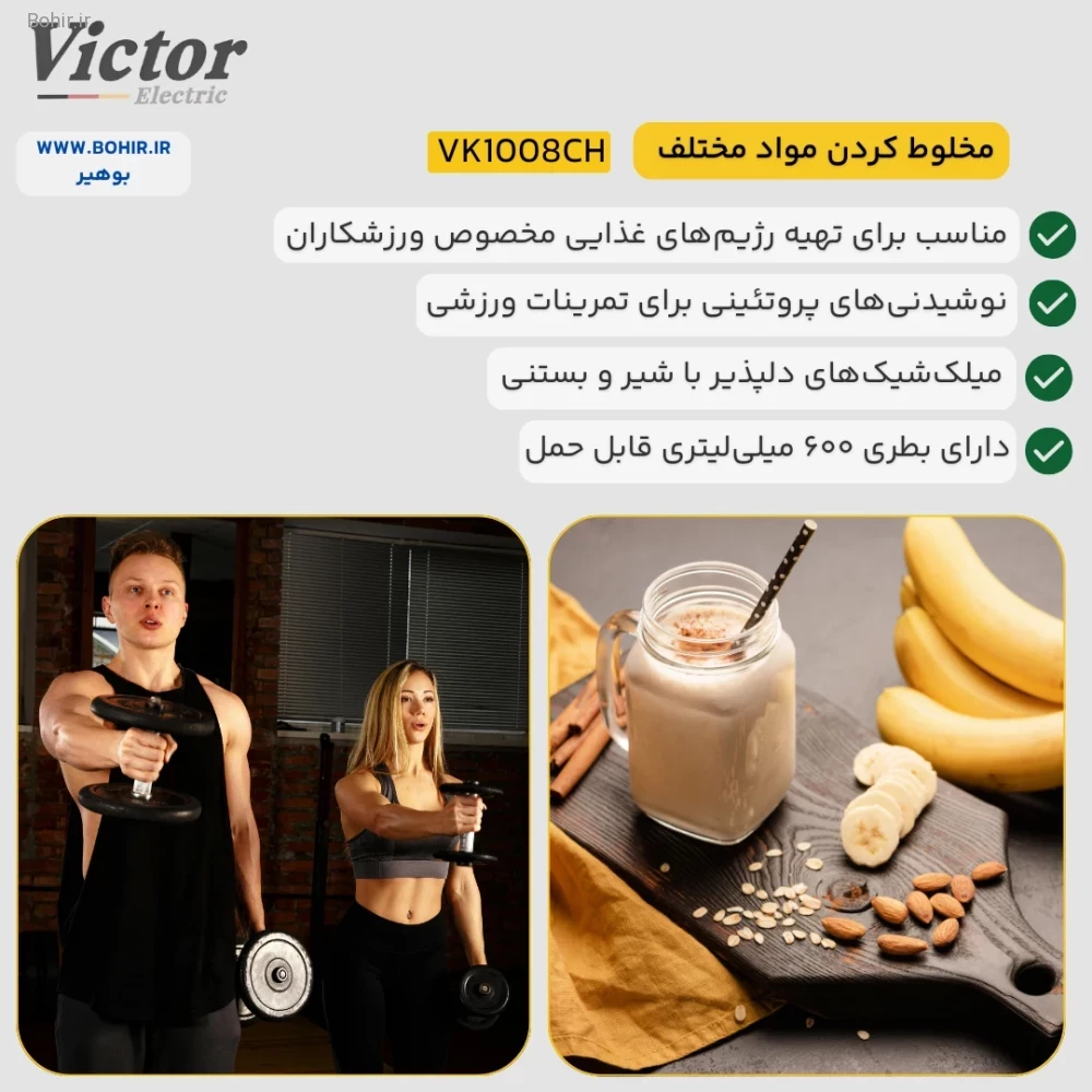 خردکن 3 کاره ویکتور مدل VK1008CH علاوه بر کارکردهای متنوع، مخلوط کن و اسموتی ساز به ویژه برای ورزشکاران و افرادی که به تغذیه سالم اهمیت میدهند، طراحی شده است. این دستگاه به همراه بطری ۶۰۰ میلیلیتری بدون BPA، امکان تهیه اسموتیهای تازه و سالم را فراهم میکند. بطری قابل حمل این خردکن، این امکان را به ورزشکاران میدهد که اسموتیها و نوشیدنیهای پروتئینی خود را در باشگاه، خانه یا هر مکان دیگری همراه خود داشته باشند. طراحی کاربرپسند و ایمن این بطری، استفاده آسان را در هر زمان و مکانی ممکن میسازد.